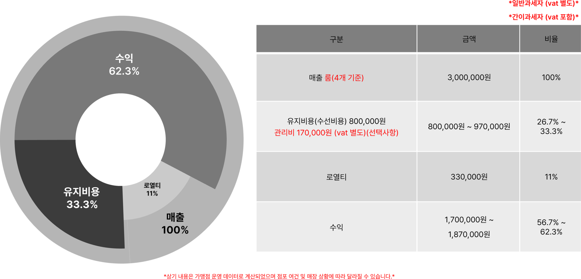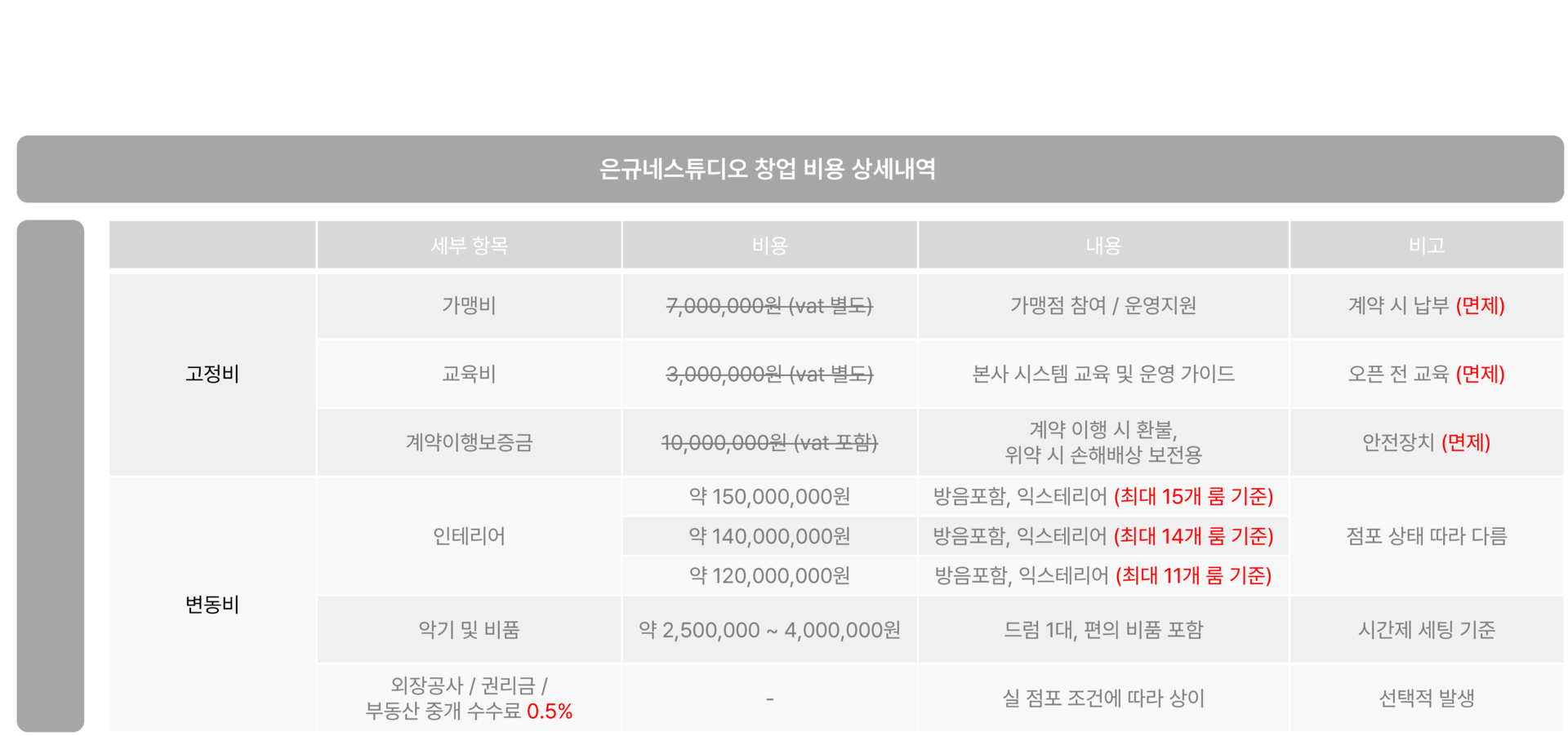 · 건물 형태, 현장상황, 품목, 수량 등에 따라 실제 금액과는 다를 수 있으며 외장 공사 및 내부 옵션 공사, 별도 공사, 각종 인허가 비용, 임대보증금, 권리금, 부동산 중개수수료