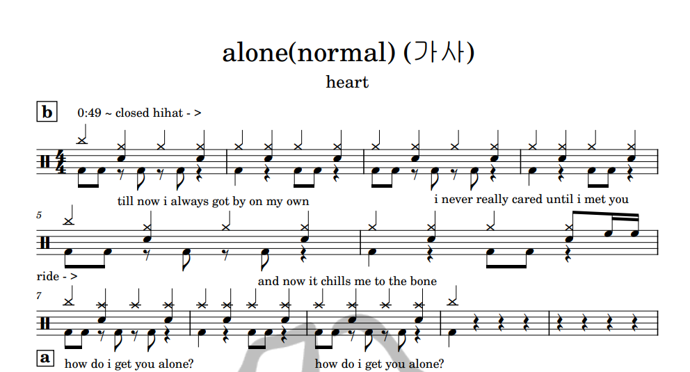[은규네스튜디오] 드럼악보 heart - alone(normal) (가사)
