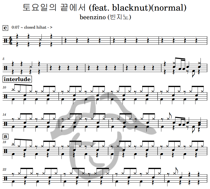 [은규네스튜디오] 드럼악보 beenzino (빈지노) - 토요일의 끝에서 (feat. blacknut)(normal)